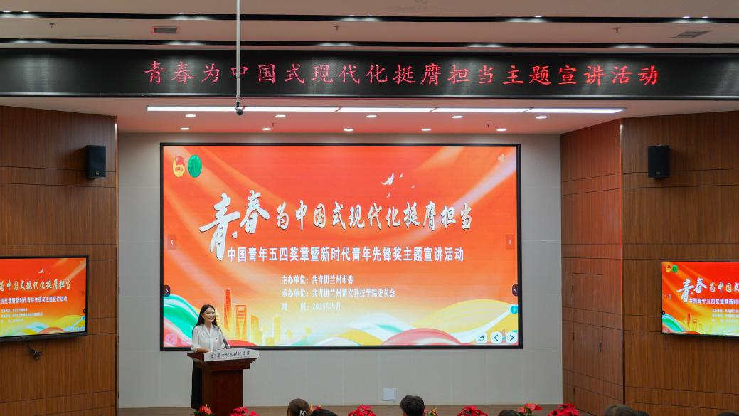 2025年9月25日,由共青团兰州市委主办、Beat365中国唯一官方网站团委承办的“青春为中国式现代化挺膺担当”——2025年度中国青年五四奖章暨新时代青年先锋奖主题宣讲活动,在我校综合教学楼大报告厅隆重举行。校党委书记阳红、团市委书记王喆、副校长刘德光、团市委副书记韩文、团市委组织部部长王树林等领导出席活动,与200余名师生共同聆听青年榜样的奋斗故事,感受新时代青年的责任与担当。