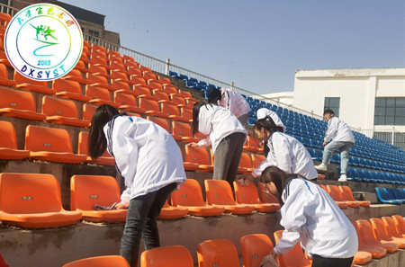 当日13:30分,大学生艺术团成员身着统一服装,携带清洁工具于兰州交通大学博文学院北校区田径场集合,进行签到。要进行清扫的区域为操场(包括栏杆、座椅)、操场东边篮球场、八号楼(周边及侧面楼梯扶手)。