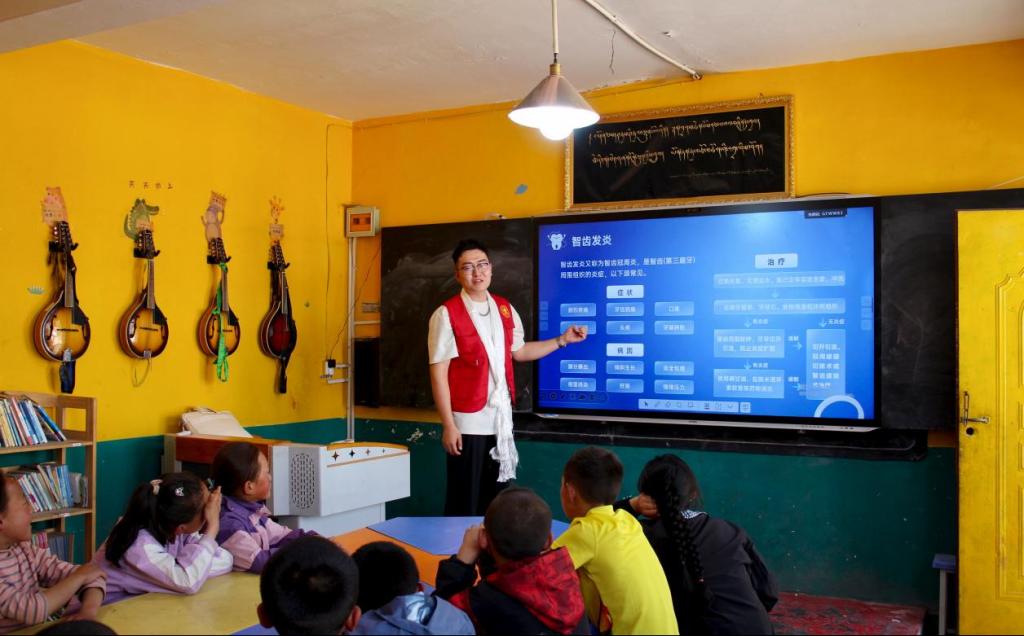 哇代行政村小学地处甘南草原深处,现有学生60余名藏族儿童,孩子们因家庭和环境条件,课外知识接触较少。星火燎原实践团结合当地实际与学生特点,精心设计了口腔卫生健康小课堂。在口腔健康课堂上,志愿者们通过PPT展示、互动游戏的形式,让孩子们在轻松氛围中学习如何保护口腔卫生与维护口腔健康,不少孩子从最初的羞涩腼腆,逐渐变得敢于开口、乐于表达。此外,星火燎原实践团还针对当地留守儿童较多的情况,通过团体游戏、一对一交流等方式,倾听孩子们的心声,给予情感关怀。