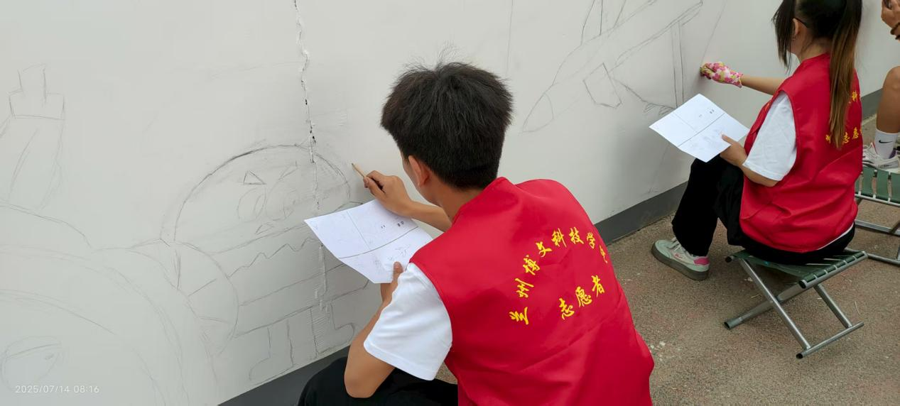 从7月14日晨光熹微到15日暮色四合,10多余名师生志愿者分秒必争:志愿者顶着炎炎烈日蹲在滚烫的混凝土墙根勾勒轮廓,覆漆组借着暮色检查每一处漆膜平整度……48小时里,他们累计弯腰起身超千次,消耗高耐候丙烯颜料180升,最终在灰白的墙体上呈现出以“沙海绿洲,时间之河”为主题的系列巨幅彩绘。