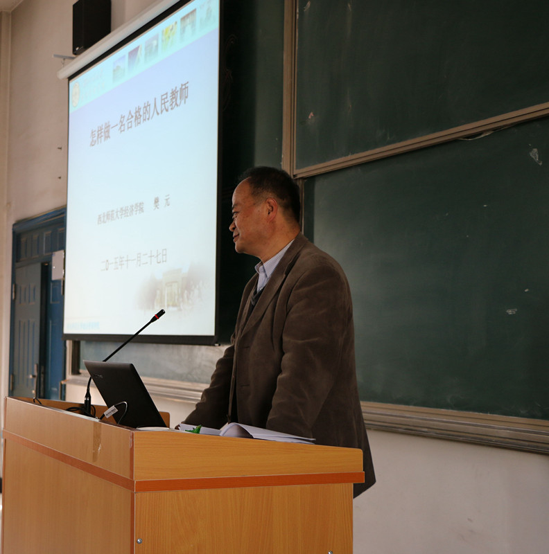 11月27日,我院省内客座教授——西北师范大学樊元教授应邀来我院做了“怎样做一名合格的人民教师”的学术报告。报告由教务处郭斌处长主持。王西林副院长、学院各系(部)的教学和管理人员参加了本场报告会。 报告中...