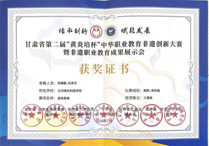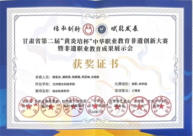 近日,我院学子在“甘肃省第二届“黄炎培杯”中华职业教育非遗创新大赛暨非遗职业教育成果展示会”中表现出色,荣获二等奖1项,三等奖2项,为学院、学校争得了荣誉。