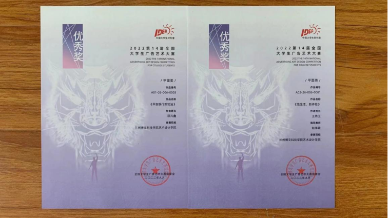 在第十四届全国大学生广告艺术大赛中,艺术设计学院斩获全国优秀奖2项及甘肃赛区一等奖2项、三等奖1项。