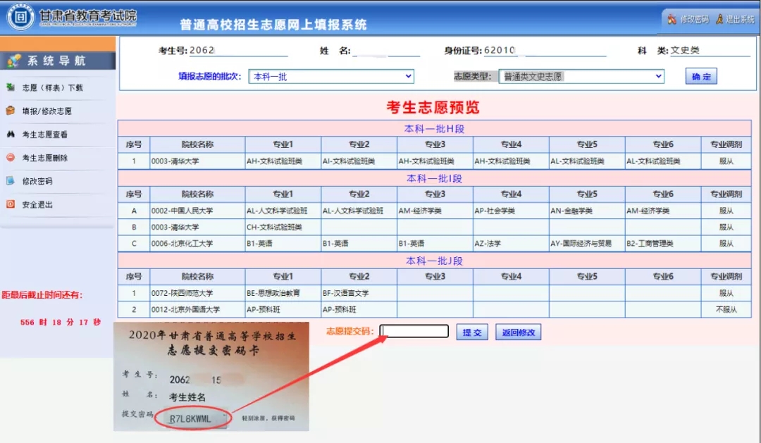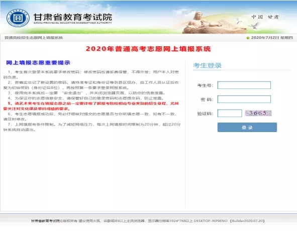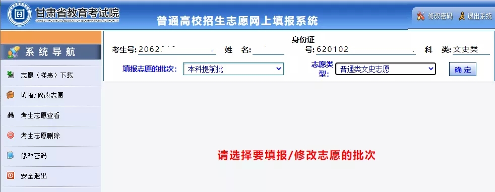 一、填报时间 2020年我省普通高校招生网上填报志愿分两次进行,具体安排如下: 第一次填报 时间:2020年7月25日20:00开始填报,7月27日20:00截止。 批次:本科提前批(A段、B段、C段、D段、E段、F段、G段);本科一批(H段、I段、J段);本科二批(K段、L段);高职(专科)批(P段、Q段);体育、艺术类本科一批(T段、U段、V段);体育、艺术类本科二批(W段)。 第二次填报 时间:2020年9月4日20:00开始填报,9月6日14:00截止。 批次:高职(专科)批(R段、S段);体育、艺术类高职(专科)批(X段)。 二、注意事项 1、网上填报志愿对考生上网地点不作限制。有上网条件的考生自行选择上网地点,不具备上网条件的考生到高考报名所在县(区)招生办指定的地点填报。 2、登录系统前,考生需先浏览甘肃省教育考试院主页阅读我省普通高校招生的相关政策、规定及通知,再按照《2020年甘肃省普通高等学校招生专业目录》公布的招生院校及计划,可预先填写《2020年甘肃省普通高校招生志愿样表》。 3、系统登录密码:是考生登录填报系统的身份确认密码。修改初始密码后,考生要牢记新密码。如不慎忘记,考生须凭准考证、身份证到报名所在县(区)招生办指定的填报点进行密码重置。 4、志愿提交密码:志愿提交密码卡上的“提交密码”是考生提交志愿信息的唯一密钥。考生要妥善保管,不得外泄。建议考生一定要牢记、保密和备份。如丢失造成志愿无法提交时,及时与报名所在县(区)招生办联系。 系统登录密码和志愿提交密码是考生本人填报志愿的重要信息,如因考生保管不善,造成密码泄露等相关问题,后果自负。 5、考生须对本人填报的志愿信息负责,在规定填报志愿的时间内,可多次登录系统修改志愿,逾期不得再登录修改。考生应尽早填报志愿,尽量避免在临近关闭网络时填报或修改志愿,以防止网络拥堵、停电、计算机故障等意外情况导致无法正常填报志愿。 6、考生在填报过程中如遇到技术问题,可向填报点管理员咨询。 三、操作流程及说明 1、考生打开浏览器直接输入zytb.ganseea.cn进入填报系统进行志愿填报,也可通过甘肃省教育考试院主页(www.ganseea.cn)上的“高考高招”栏目下的“志愿填报”链接进入填报系统进行志愿填报。登录界面如下: 考生输入本人考生号、密码(考生第一次登录系统密码:身份证号后八位)及验证码等登录志愿填报系统。 2、考生若是第一次登录,系统将要求修改密码。初始密码修改界面如下: 密码修改后考生一定要牢记。征集志愿时,仍使用该密码。 3、密码修改后,系统自动返回登陆界面,并要求考生用新密码重新登录。登录后进入“网上填报志愿考生注意事项”界面: 阅读完注意事项后,考生点击“开始填报志愿”按钮进入志愿填报首页。 4、进入志愿填报界面后,考生要先浏览“系统导航”,导航界面如下: 待了解导航内容及功能后,考生可根据预先填好的“志愿样表”按照系统提示和要求逐批进行填报。填报参考界面如下: 考生进入填报界面后超过20分钟不操作,系统将自动退出。 5、志愿填报完成后,考生点击“志愿预览”按钮进入“考生志愿预览”页面。考生如认为志愿不需修改的可直接在“志愿提交码”栏输入“志愿提交密码”按“提交”按钮提交志愿,如认为还需修改则点击“返回修改”按钮返回上一页面进行修改。提交志愿时,考生必须使用“志愿提交密码”进行志愿提交,否则志愿无效。 提交后,页面弹出“志愿提交成功”字样(下图),表示志愿提交成功。 6、志愿提交后,考生如要删除某批次志愿,点击“系统导航”栏中的“考生志愿删除”选项,选择批次后,使用“志愿提交密码”删除志愿。 7、志愿提交后,如考生要修改某批次志愿,点击“系统导航”栏中的“填报/修改志愿”选项,选择批次后,使用“志愿提交密码”修改志愿。 8、考生志愿填报最终结束后,选择“系统导航”栏中的“考生志愿查看”选项,点击“检查志愿正确性”按钮,如弹出下图则表示已填报志愿全部有效。