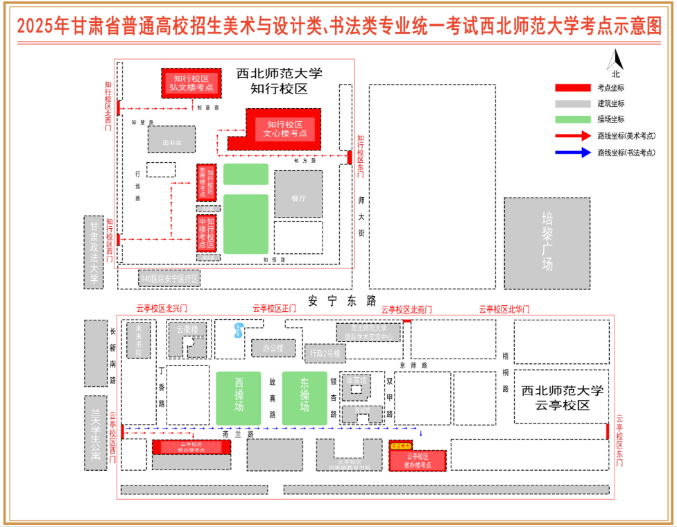 考点设在西北师范大学云亭校区(地址:兰州市安宁区安宁东路967号)及西北师范大学知行校区(地址:兰州市安宁区邱家湾37号)。