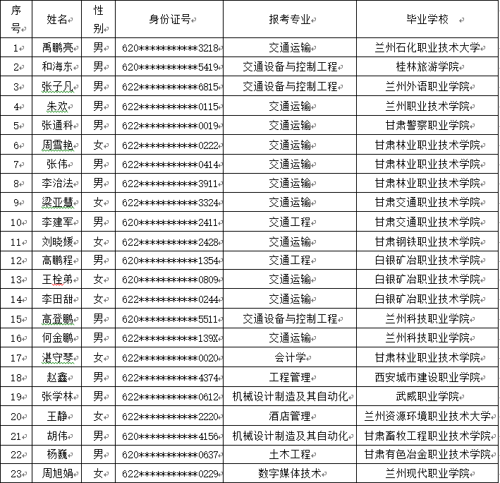 根据《甘肃省普通高等学校高职(专科)升本科考试招生工作方案(试行)》(甘教发函〔2021〕46号)和《2022年甘肃省普通高校高职(专科)升本科免试生招生工作实施方案》(甘招委发〔2022〕1号)的文件精神,现将我校免试生拟录取名单予以公示(详细名单见下表),公示期为2022年3月5日至3月9日。