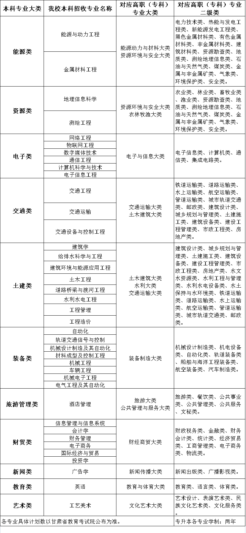 根据甘肃省高等学校招生委员会《2023年甘肃省普通高校高职(专科) 升本科统一考试招生工作实施方案》(甘招委发〔2023〕2号)和甘肃省教育厅《2023年甘肃省普通高等学校高职(专科)升本科考试招生工作方案》(甘教发〔2022〕9号)有关要求,为做好我校2023年普通高校高职(专科)升本科(以下简称“普通专升本”)考试招生工作,结合我校办学实际,制定并公布本招生简章。