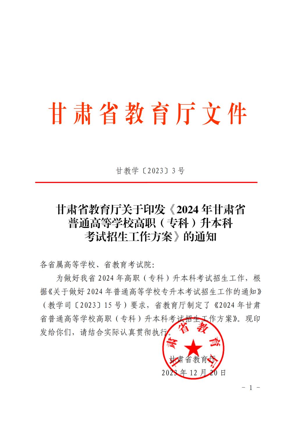 甘肃省教育厅关于印发《2024 年甘肃省 普通高等学校高职(专科)升本科 考试招生工作方案》的通知