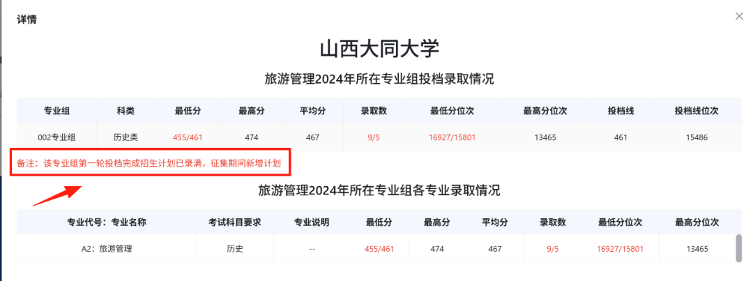 点击“详情”按钮可查看2025年招生专业所在2024年专业组投档录取情况,包括2024年专业组最低分、最高分、平均分、录取数、最低分位次、最高分位次、投档线、投档线位次及各专业投档录取情况,如有特殊情况时,会用红色备注说明。