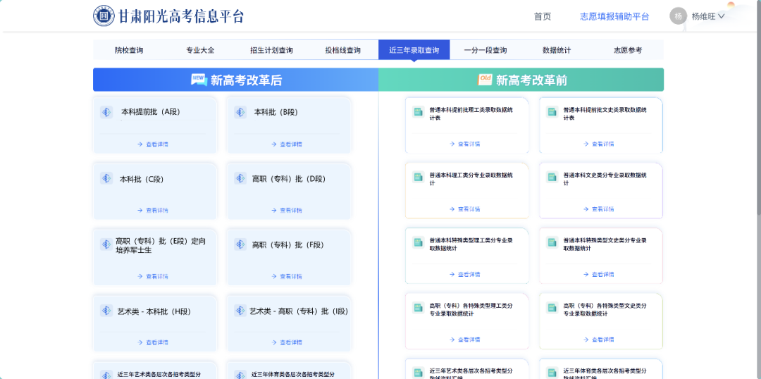 近三年录取查询涉及新高考改革前后录取查询情况,主要包含各批次、各类别、各招考类型录取数据统计。